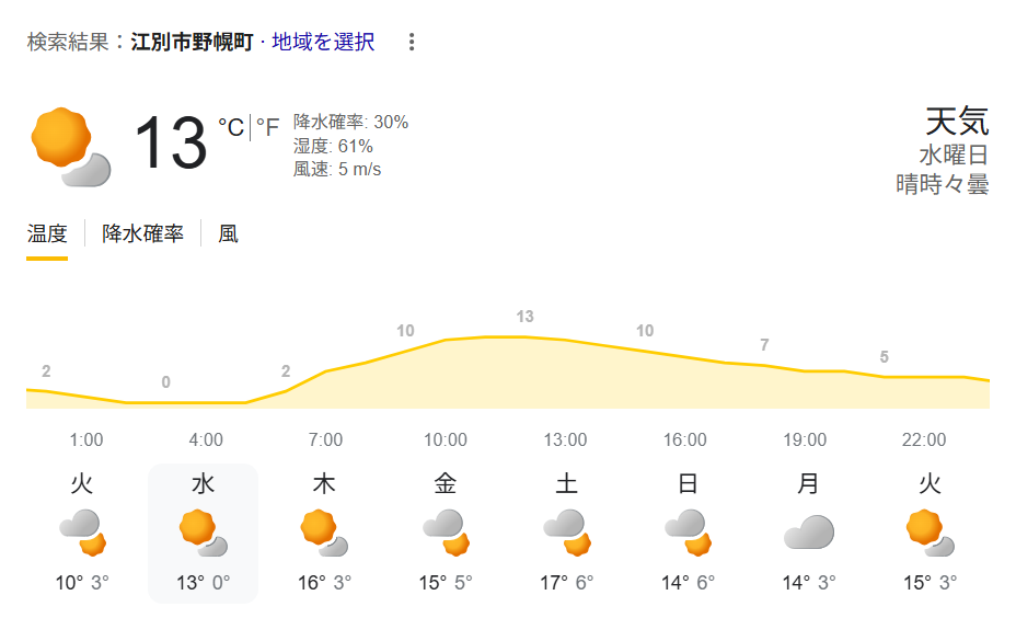現時点での天気予報では最高気温が13℃、最低気温は3℃となっております。